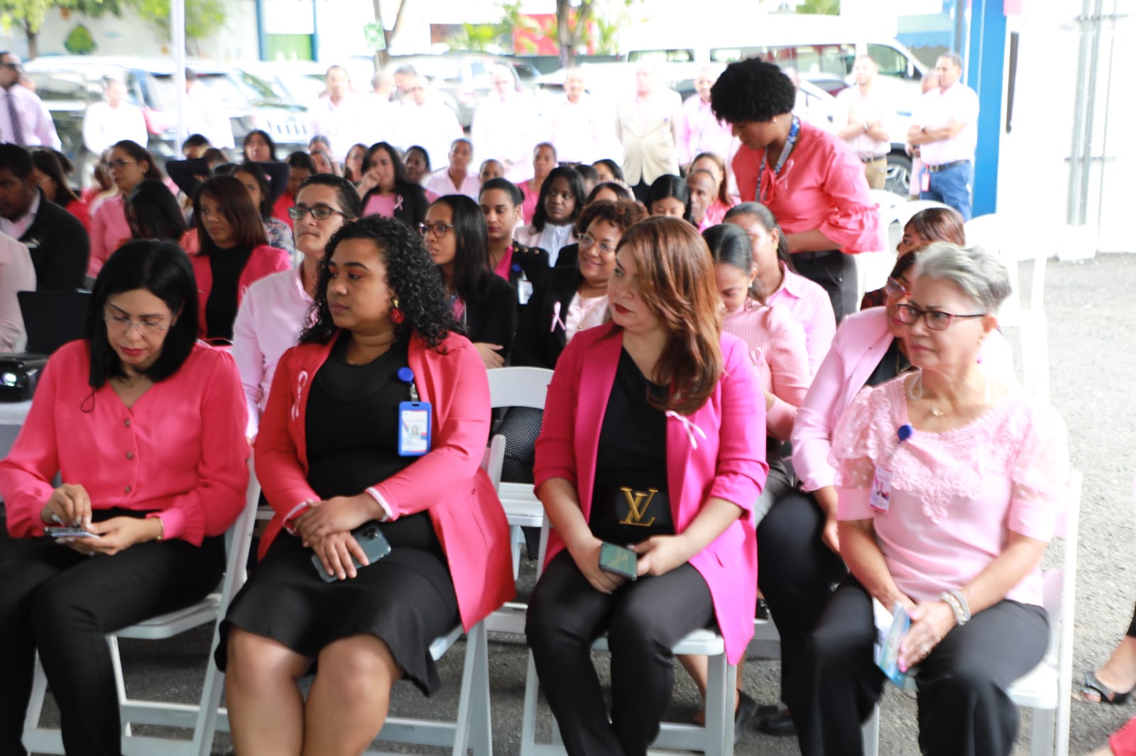 En un emotivo acto, celebrado en la explanada de Promipyme, en el que participo todo el personal con vestimenta color rosa, Milagros Vázquez, directora de Gestión Humana, en sus palabras de apertura exhorto a hombres y mujeres a realizarse sus chequeos a tiempo, para prevenir cáncer de mama.